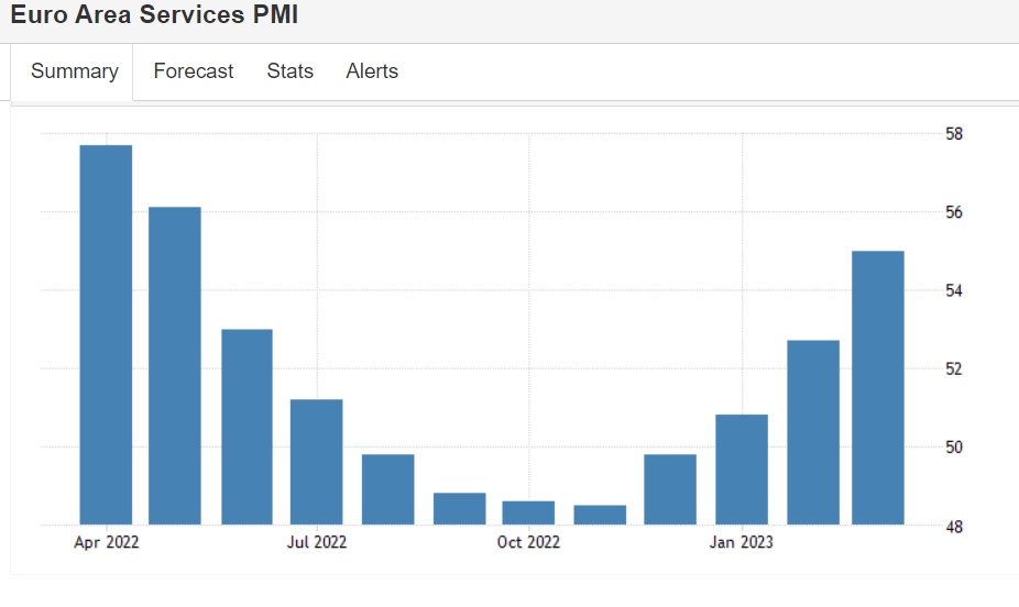 数据显示,涵盖欧元区主要服务业的服务业PMI指数从2月份的52.7快速反弹至55.0,不过低于市场预期的55.6。此外,数据还显示,尽管活动和需求趋势有所改善,但商业信心有所减弱。