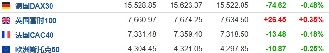 2. 截至发稿,德国DAX指数跌0.48%,英国富时100指数涨0.35%,法国CAC40指数跌0.18%,欧洲斯托克50指数跌0.25%。
