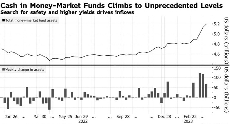 由于对银行业的担忧令全球市场不安,同时诱人的利率吸引着投资者,所有货币市场基金的资金量上月攀升至新高。根据美国投资公司协会(Investment Company Institute)的数据,货币基金的现金储备在三周内增加了约3040亿美元,截至3月29日,总资产达到5.2万亿美元。