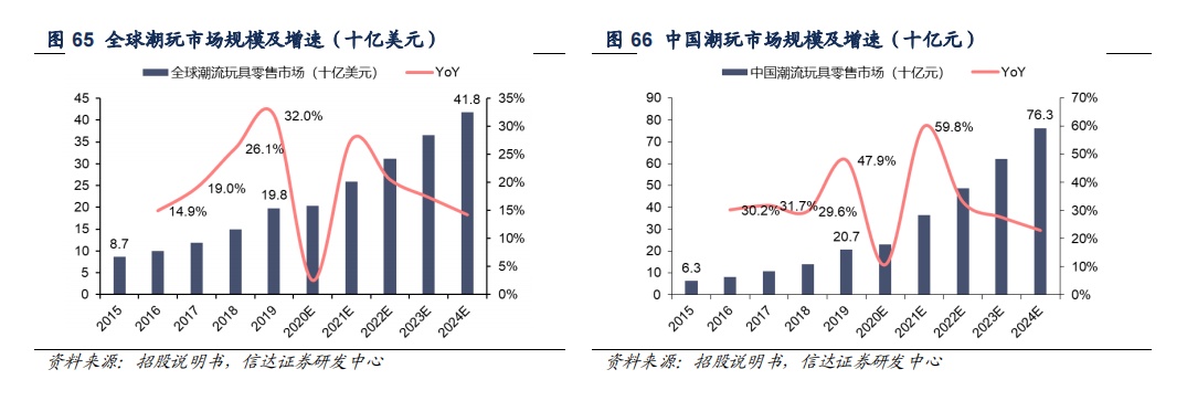 据信达证券披露,随着潮流文化产业的快速发展,更多优质的潮玩IP涌现,预计到2024年全球潮玩零售市场规模将达到418亿美元,这一数字是同期国内市场规模的3倍有余,2020年~2024年CAGR预计将达到16.1%。