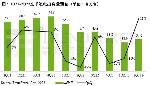 智通财经APP获悉,据TrendForce集邦咨询研究显示,2023年第一季全球笔电出货量约3,390万台,季减13%、年减39%,主要是经济疲软持续影响消费市场信心,拖累渠道笔电整机去化进度,也进一步促使品牌调降代工厂订单,以有效调节库存压力。第二季在笔电整机及零组件库存压力将会缓解的预期下,渠道回补需求可望逐月增强,同时带动第二季笔电出货量提升至3,763万台,季增11%,但仍较去年同期衰退18%。