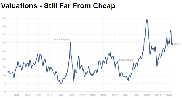 虽然许多优质科技股被抛售(恐慌性抛售)到极度超卖和低估的水平,但许多股票可能还没有看到低点。Dergunov指出,CAPE将继续回落,直到到达22-24附近;这种动态意味着标普500指数可能会再次下跌约20-25%,这表明熊市的真正底部可能在未来几个月达到3000-3400点左右。