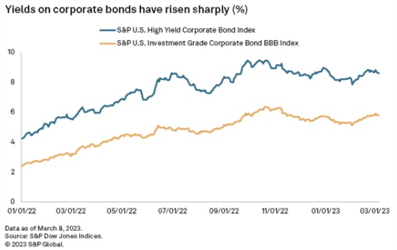 尽管公司债券收益率的大幅上升令人担忧,但考虑到具有挑战性的宏观经济环境和紧缩的货币氛围,这并不令人意外。自2022年开始以来,垃圾债券的利率已从4%上涨至8%,大约翻了一番。也许更糟糕的是,在“投资级”公司债券上也有类似的动态,收益率从2%左右上升到4%以上。