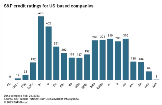 到目前为止,并不是所有重要的美国公司都拥有良好的信用评级。相反,许多公司评级处于B至BBB区间,甚至也有公司评级为B-。这说明企业信用等级正在恶化。许多公司将需要在更高的利率制度下整合债务,这导致债务支付高于预期,违约风险增加。