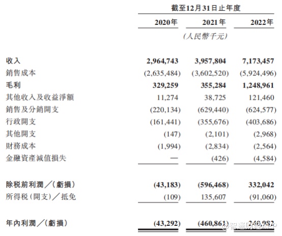 在业绩方面,公司营收与利润双双录得快速增长,2020-2022年间营收分别为29.6亿元、39.6亿元以及71.7亿元(单位:人民币,下同),毛利润分别为3.3亿元、3.6亿元以及12.5亿元,并于2022年首次实现扭亏为盈,净利润为2.4亿元。