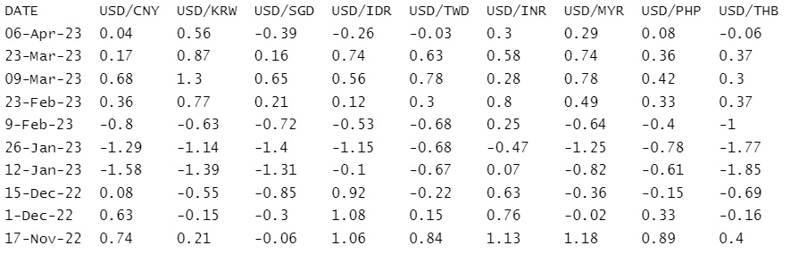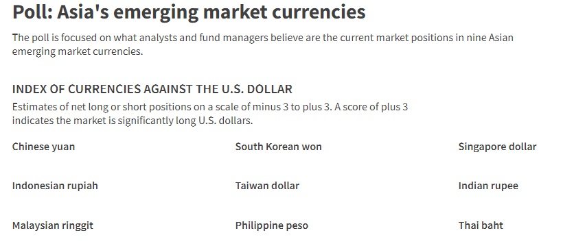 亚洲货币仓位调查的重点是分析师和基金经理对九种亚洲新兴市场货币当前市场仓位的看法,分别是:人民币、韩元、新加坡元、印尼盾、新台币、印度卢比、菲律宾比索、马来西亚林吉特和泰铢。