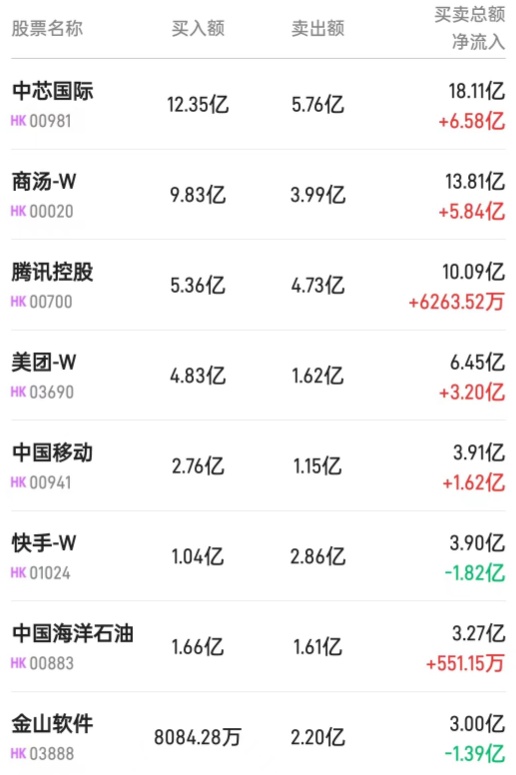 北水净买入最多的个股是中芯国际(00981)、商汤-W(00020)、美团-W(03690)。北水净卖出最多的个股是腾讯(00700)、建设银行(00939)、金山软件(03888)。
