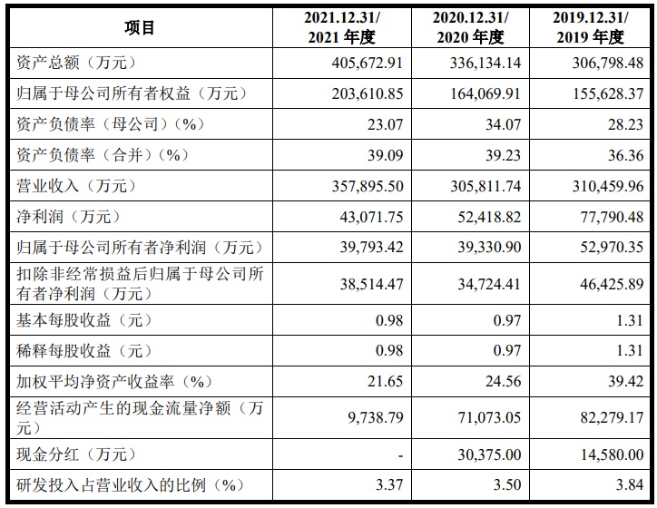财务方面,于2019年度、2020年度及2021年度,公司实现营业收入分别约为31.05亿元、30.58亿元及35.79亿元人民币;净利润分别约为7.78亿元、5.24亿元及4.31亿元人民币。