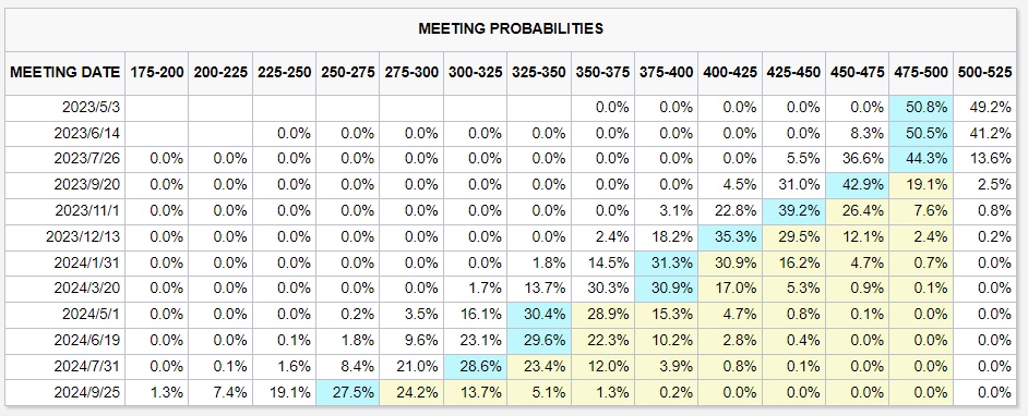 这份就业报告将是美联储5月会议前的最后一份就业报告。根据CME“美联储观察工具”,市场预计美联储5月份不加息的概率为50.8%,加息25个基点的概率为49.2%。
