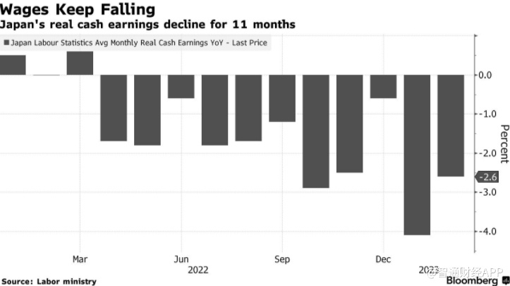 智通财经APP获悉,日本工人的实际工资连续第11个月下降,尽管日本政府一直在推动提高工资,这突显出新任日本央行行长植田和男面临的挑战。日本厚生劳动省周五公布的数据显示,日本2月实际薪资收入同比下降2.6%,符合预期。这一数据受到密切关注,因为许多人预计,更强劲的薪酬数据将促使新任行长领导下的日本央行考虑结束超宽松政策。