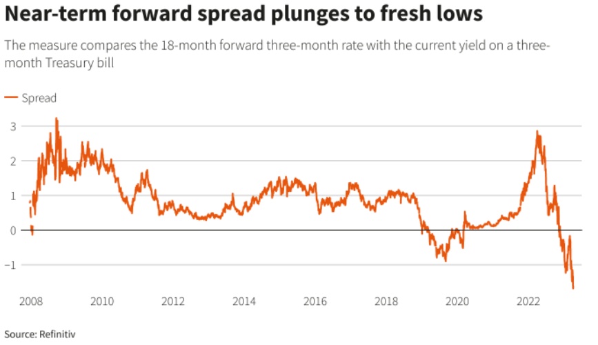 美联储青睐的经济衰退指标亮起红灯,为那些认为美联储将很快需要降息以重振经济活动的观点提供了支持。美联储的研究认为,将18个月后美国国债远期利率与3个月期美国国债当前收益率进行比较的“短期与远期利差”,是预示经济是否即将收缩的最可靠债券市场信号;这一利差自去年11月以来一直处于负值,本周跌至新低,周四接近负170个基点。刷新了自1996年以来新低。