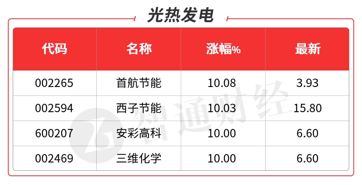 光热发电迎来政策催化,这项技术可以大幅提升效率。龙头首航高科(002665.SZ)被顶一字。后排有西子节能(002534)等。