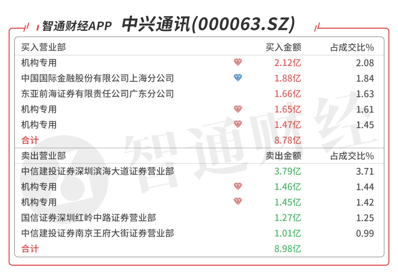 中兴通讯(000063.SZ):龙虎榜阵容豪华,今日共5家机构席位出现在龙虎榜单上,对倒合计净买入2.33亿元,买二是量化基金的席位对倒净买入1.5亿元,当日买卖均衡,该股今日放量涨停,预计走趋势为主。