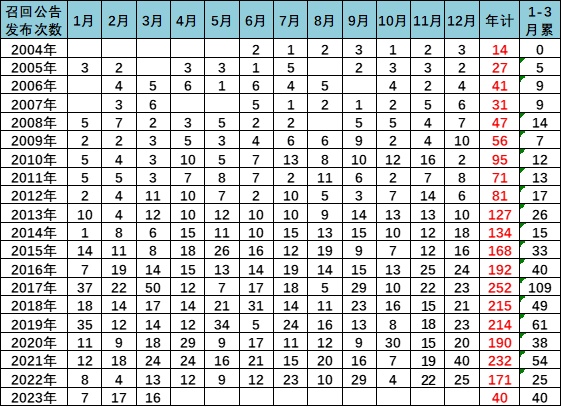 2023年3月份召回数量达到16次和19万台,3月相对历年同期的召回幅度很少。历年315前的召回较多,今年的较少体现了政策照顾支持行业发展的感觉。