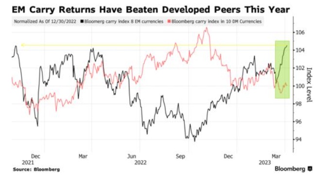 伦敦NatWest Markets Plc的新兴市场策略师Eimear Daly表示:“与直觉相反,3月份的金融市场波动可能只是重新点燃新兴市场套利交易的入场券。现在美国利差可能会受到限制,投资者将被吸引回到新兴市场的高利差货币,并获得大量的套利。”