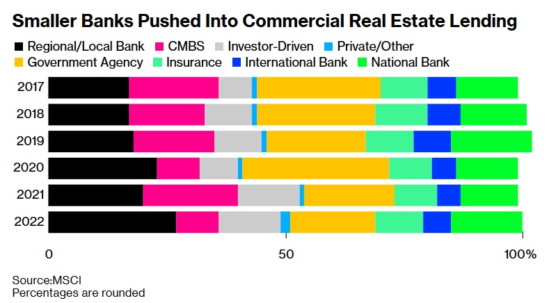 更令人头疼的是,在硅谷银行“光速倒闭”之后,美国的小型和地区性银行(去年银行业最大规模的信贷来源)受到存款外流带来的巨大负面冲击,令人担心它们向借款人提供融资的能力将受到削弱,这也使得投资者们对于美国商业地产的信心开始缩减。