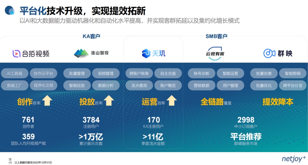 财报显示,2022年,该公司的商业短视频的月产能规模突破约21,400条;全职视频制作团队人均每月产能最高超过359条视频,同比提升32.5%。与此同时,该公司利用自主研发的商业视频撮合交易平台合拍视频,所搭建的创作者生态也进一步扩大,截至报告期末已连接了761个视频创作个人或机构,同比提升22.7%,进一步增强了公司内容生产的高度规模化和自动化水平。