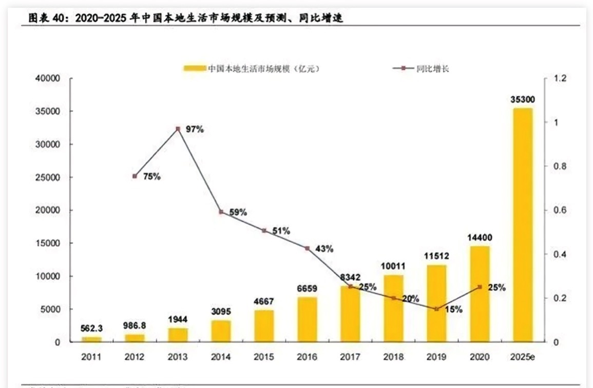 就拿本地生活来说,目前短视频“双雄”抖音和快手也将在短视频领域的龙争虎斗延续到本地生活领域。先是抖音不断加码本地生活业务,从去年6月的抖超送货上门到今年1月的抖音超市正式上线;再则快手也不甘示弱于去年新成立本地生活事业部,一再升级本地生活的业务地位。两大龙头纷纷加码本地生活,看中的便是本地生活赛道“宽又广”的发展空间:据艾瑞咨询数据,预计到2025年本地生活服务市场规模将迅速增长到35.3万亿元,线上渗透率也大幅提升至30.8%。
