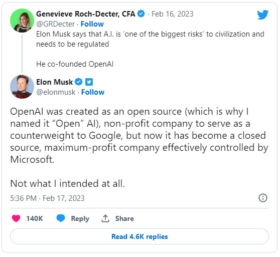 Musk在2月发推文称:″OpenAI是作为一个开源(这就是为什么我把它命名为‘开放’AI)的非盈利公司而创建的,旨在与谷歌抗衡,但现在它已经成为一个由微软有效控制的闭源、最大利润公司,这根本不是我的本意。”
