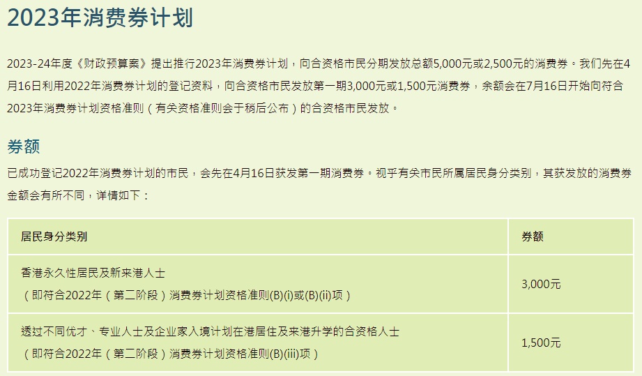 该计划指出,4月16日,先向合资格市民发放第一期3000元或1500元消费券,余额会在7月16日开始向符合2023年消费券计划资格准则的合资格市民发放。