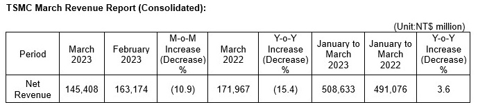 智通财经APP获悉,台积电(TSM.US)销售额连续第二个季度低于预期,显示全球电子产品需求持续疲软。据计算,这家全球最大的芯片代工制造商第一季度收入为5086亿元新台币,低于分析师平均预期的5255亿元新台币。台积电表示,3月份销售大幅放缓是业绩下滑的原因之一:3月份销售额同比下降15%,至1454亿元新台币。