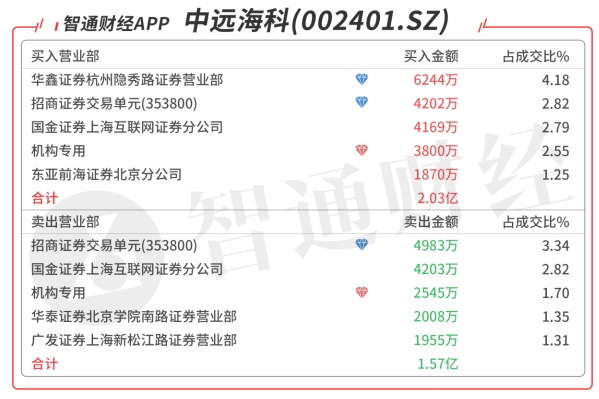 中远海科(002401.SZ):多主力现身龙虎榜,2家机构席位对倒净买入1703万元,买一是知名游资的席位买入6244万元,当日净买入5219万元,该股今日尾盘封板,注意近期高点附近压力。
