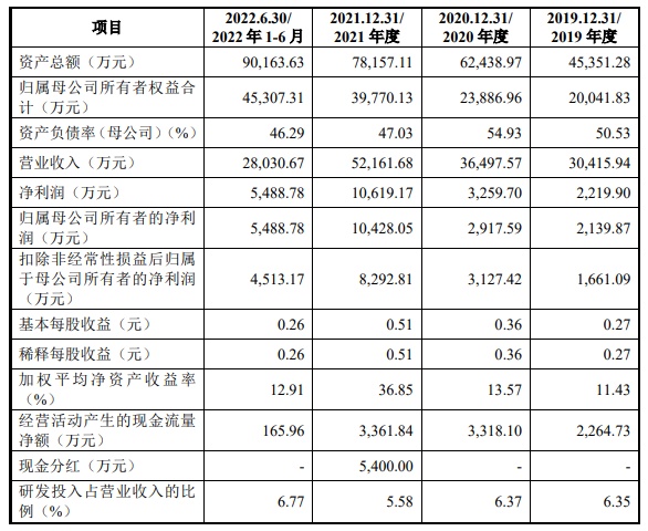 财务方面,于2019年度、2020年度、2021年度及2022年上半年,该公司实现营业收入分别约为3.04亿元、3.65亿元、5.22亿元及2.80亿元人民币;净利润分别约为2219.9万元、3259.7万元、1.06亿元及5488.78万元人民币。