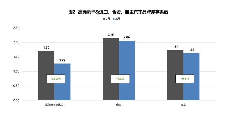 从品牌库存系数来看,高端豪华&进口、合资、自主品牌库存系数下降。其中,高端豪华&进口品牌库存系数为1.27,环比下降25.3%;合资品牌库存系数为2.06,环比下降4.2%;自主品牌库存系数为1.63,环比下降6.3%。