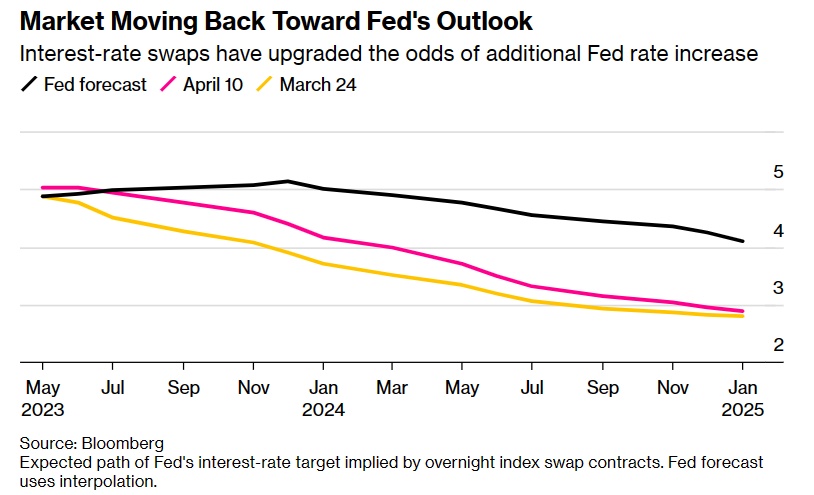 由于上周五美国在假期缩短的交易时段公布了强劲的就业数据,交易员提高了美联储5月份再次加息25个基点的可能性。与美联储会期挂钩的互换合约定价表明,美联储在5月3日将政策利率区间上调至5%-5.25%的可能性超过80%。5月份的合约利率上升至略高于5.03%,较上次加息以来的有效政策利率高出20个基点。