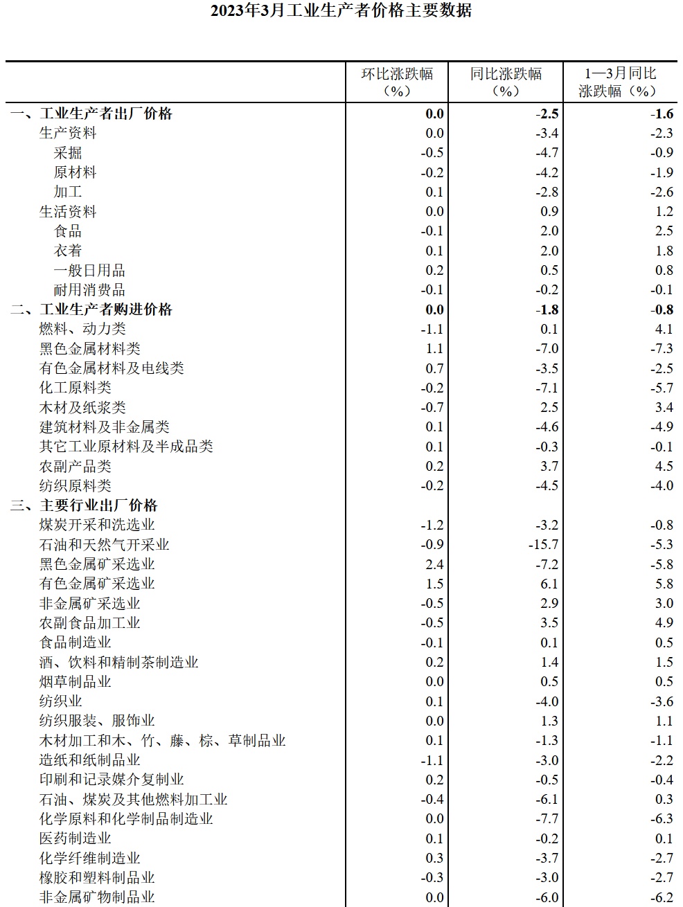 智通财经APP获悉,4月11日,国家统计局数据显示,3月份,全国工业生产者出厂价格同比下降2.5%,环比持平;工业生产者购进价格同比下降1.8%,环比持平。一季度,工业生产者出厂价格比去年同期下降1.6%,工业生产者购进价格下降0.8%。