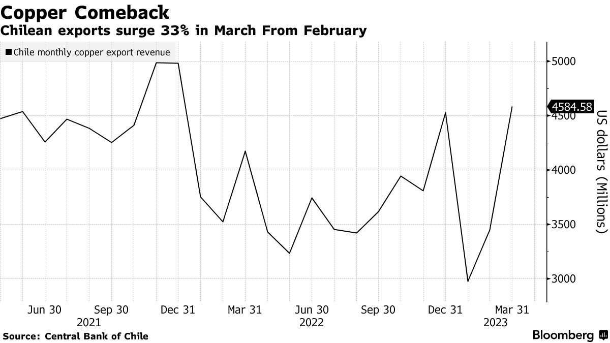 智通财经APP获悉,智利铜出口带来的收入在今年头两个月因某些限制因素而大幅下滑后,在3月份急剧反弹,这对于全球铜供应趋紧局面起到了强劲的改善作用。智利央行周一公布的最新数据显示,在铜金属价格平均小幅回落的情况下,智利这个全球最大铜生产国的铜出口总收入却环比激增达33%,达到一年多来的最高水平。