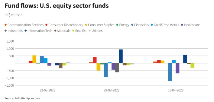 在行业基金中,投资者分别从金融和医疗基金撤出了12亿美元和6.94亿美元,但科技基金获得了5.66亿美元的资金流入。
