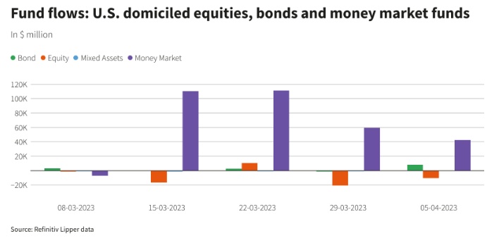 根据Refinitiv Lipper的数据,截至4月5日当周,美国货币市场基金净流入425.1亿美元。不过,这是自3月8日以来最小的单周净购买量。