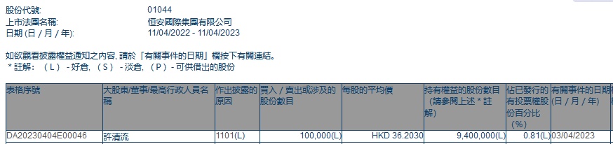 智通财经APP获悉,香港联交所最新资料显示,4月3日,执行董事许清流增持恒安国际(01044)10万股,每股作价36.203港元,总金额为362.03万港元。增持后最新持股数目为940万股,最新持股比例为0.81%。