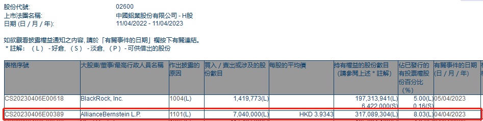 智通财经APP获悉,香港联交所最新资料显示,4月4日,AllianceBernstein L.P.增持中国铝业(02600)704万股,每股作价3.9343港元,总金额约为2769.75万港元。增持后最新持股数目约为3.17亿股,最新持股比例为8.03%。