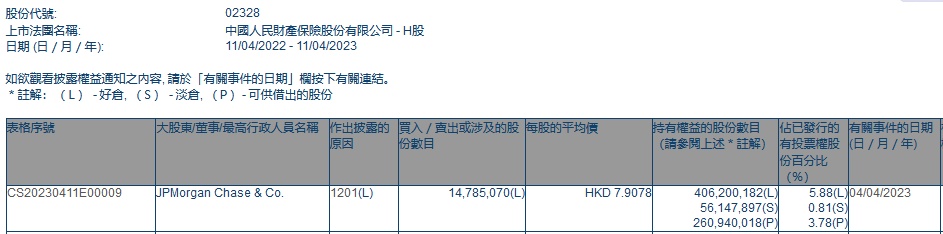 智通财经APP获悉,香港联交所最新资料显示,4月4日,小摩减持中国财险(02328)约1478.51万股,每股作价7.9078港元,总金额约为1.17亿港元。减持后最新持股数目约为4.06亿股,最新持股比例为5.88%。