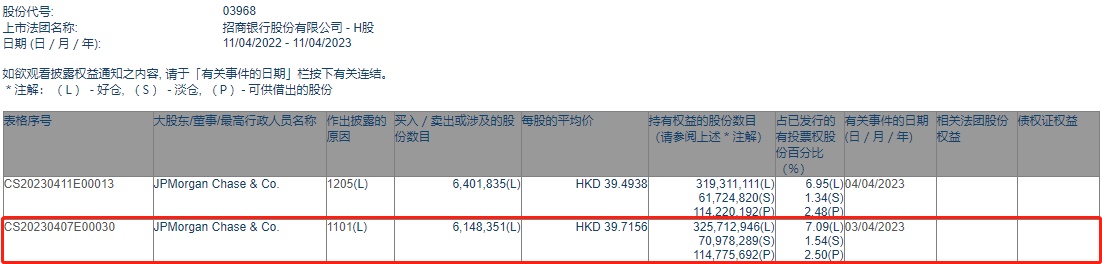 智通财经APP获悉,联交所最新资料显示,4月3日,小摩增持招商银行(03968)614.8351万股,每股作价39.7156港元,总金额约为2.44亿港元。增持后最新持股数目约为3.26亿股,最新持股比例为7.09%。