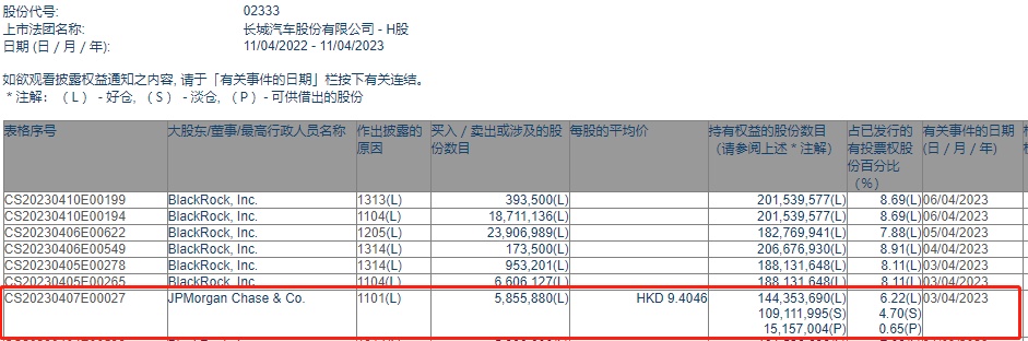 智通财经APP获悉,香港联交所最新资料显示,4月3日,小摩增持长城汽车(02333)585.588万股,每股作价9.4046港元,总金额约为5507.22万港元。增持后最新持股数目约为1.44亿股,最新持股比例为6.22%。