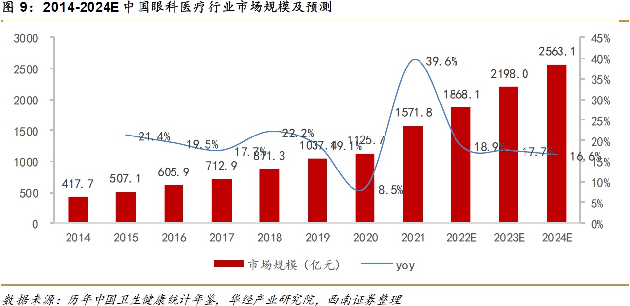 激素眼用制剂是治疗眼部炎性反应最常用和最有效的药物之一,可以快速有效控制眼科术后的炎性反应和病情。根据西南证券研报数据,我国眼科医疗行业市场预计将由2014年的417.7亿增长至2024年的2,563.1亿,CAGR约20%。此外,灼识报告资料显示,我国眼科药物市场规模预计将由2025年起以22.9%的CAGR增长至2030年的202亿美元,超过同期全球眼科药物市场的增长。随着现代工作、学习、娱乐用眼强度大幅增加,以及老龄化进程不断加速,我国眼科医疗市场持续扩容确定性高,其中屈光手术及白内障手术等市场规模更是持续扩张,与其强相关的术后针对性产品也将同步形成需求共振。