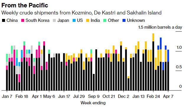 来自太平洋的原油流量小幅下降,在截至4月7日的一周内,10艘油轮在该地区的三个出口码头出货,低于前一周的11艘。