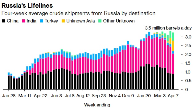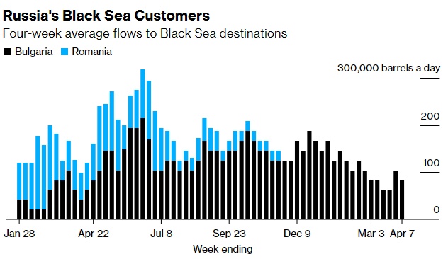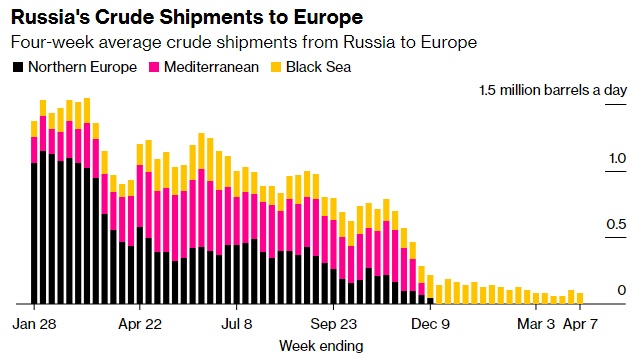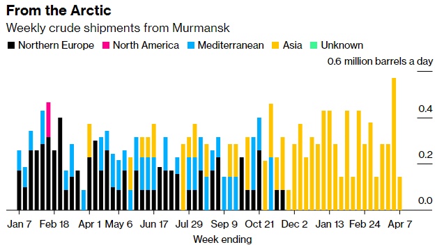 在截至4月7日的四周内,俄罗斯对欧洲国家的海运原油出口降至8.3万桶/天,保加利亚是唯一的目的地。该数字不包括运往土耳其的货物。来自波罗的海、黑海和北极的出口码头150多万桶/天的短途原油的市场已经几乎完全消失,取而代之的是流向成本更高、耗时更长的亚洲长途目的地。