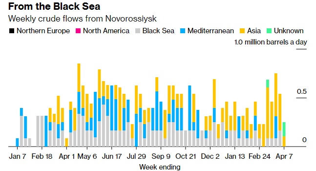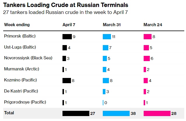 船舶跟踪数据和港口代理报告显示,在截至4月7日的一周内,共有27艘油轮装载了2020万桶俄罗斯原油,这比上周下降了870万桶,降幅达30%。目的地是基于船舶在撰写本文时发出的航行方向信号,其中一些目的地几乎肯定会随着航行的进行而改变。所有数据都不包括被确定为哈萨克斯坦KEBCO等级的货物。