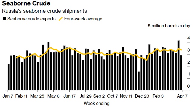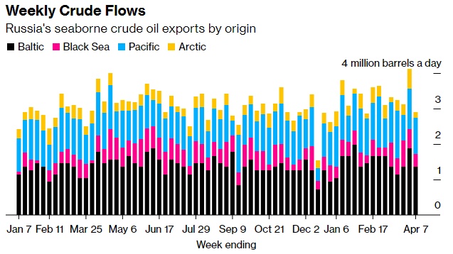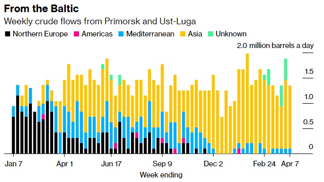 在截至4月7日的四周内,俄罗斯没有向北欧国家出口原油。