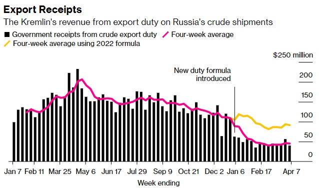 在截至4月7日的当周,俄罗斯原油出口关税流入的资金减少1700万美元,至3900万美元的五周低点,而四周平均收入小幅下降至4500万美元。