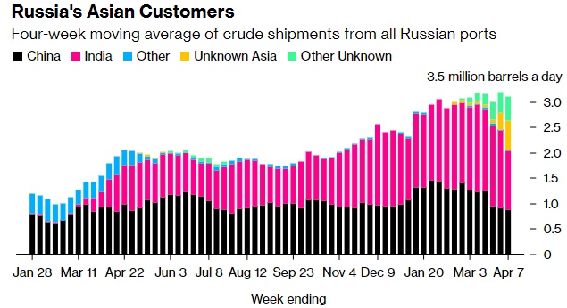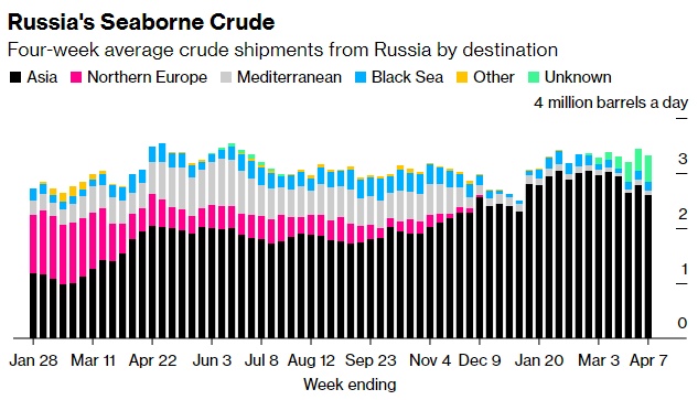 俄罗斯对亚洲客户的四周平均出货量(加上没有最终目的地的船只)小幅下降,但仍保持在300万桶/天以上。在截至4月7日的财季,出货量从此前的318万桶/天降至310万桶/天。