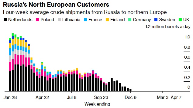 这些管道运输市场的损失意味着,尽管欧盟禁止进口几乎所有的俄罗斯原油和精炼燃料,加上七国集团的价格上限,俄威胁要减产,但现每天仍有50万桶俄罗斯原油正通过该等港口出口。