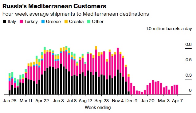 在截至4月7日的四周内,俄罗斯对土耳其的原油出口量维持在16.2万桶/天。土耳其是俄罗斯仅存的地中海客户。