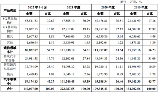 美利信主要从事通信领域和汽车领域铝合金精密压铸件的研发、生产和销售。通信领域产品主要为4G、5G通信基站机体和屏蔽盖等结构件,汽车领域产品主要包括传统汽车的发动机系统、传动系统、转向系统和车身系统以及新能源汽车的电驱动系统、车身系统和电控系统的铝合金精密压铸件。