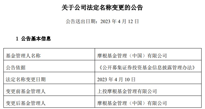 智通财经APP获悉,4月11日,上投摩根基金发布公告,公司法定名称由“上投摩根基金管理有限公司”变更为“摩根基金管理(中国)有限公司”。据悉,为将中国业务更好融入摩根资产管理的全球运营模式,摩根基金将于4月底发布关于品牌更名详情等信息。