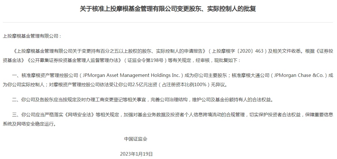 此前,上投摩根基金的外方股东——摩根资产管理向中国证监会提出100%全资控股上投摩根基金的申请,该申请已于1月19日获批。